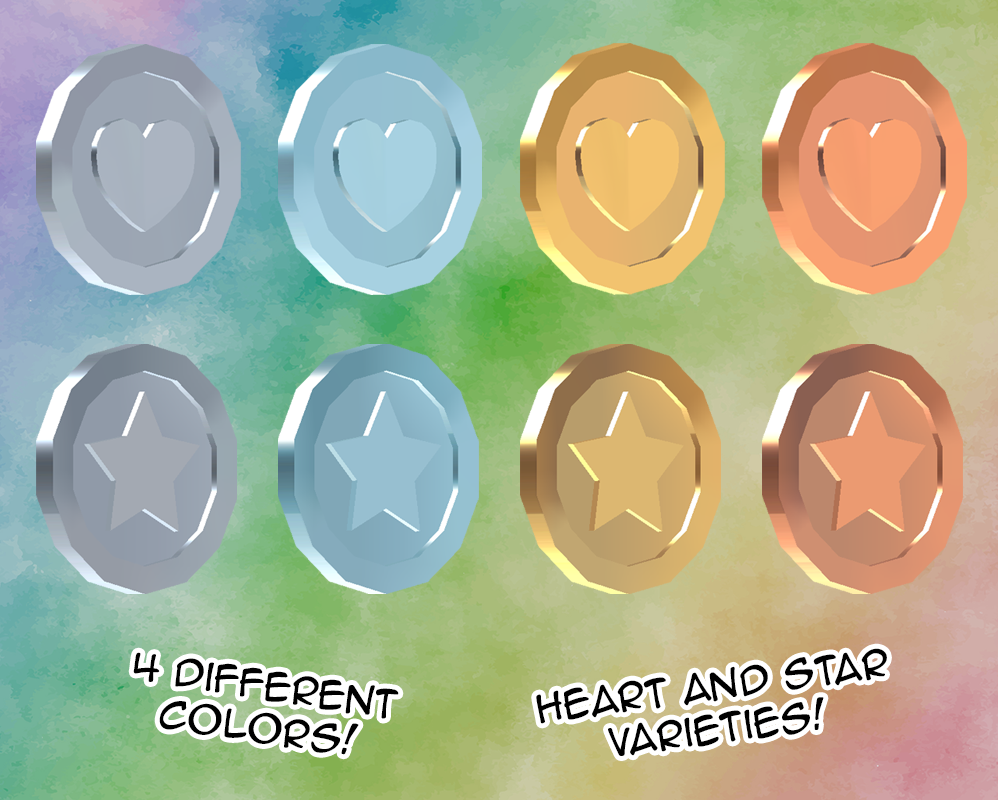 This is one set of 4 colors (copper, gold, silver, platinum) and 2 designs (star, heart) that come with 3 different light coin "clink" sounds.
