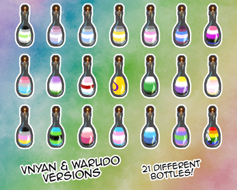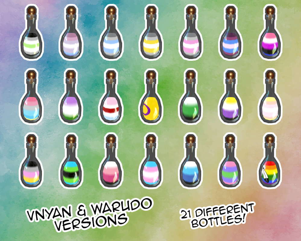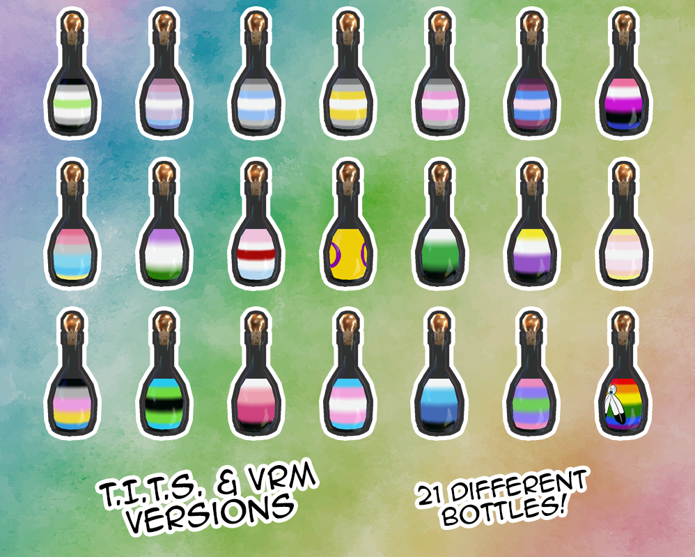Low-poly, 3D gender fluid bottles in an assortment of different Pride colors! These are for use with VNyan (suvidriel.itch.io/vnyan), T.I.T.S. (remasuri3.itch.io/tits), Warudo (warudo.app), and anywhere VRM files are used.