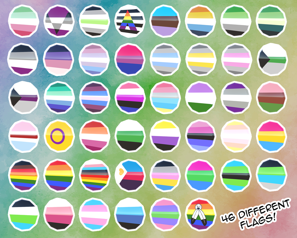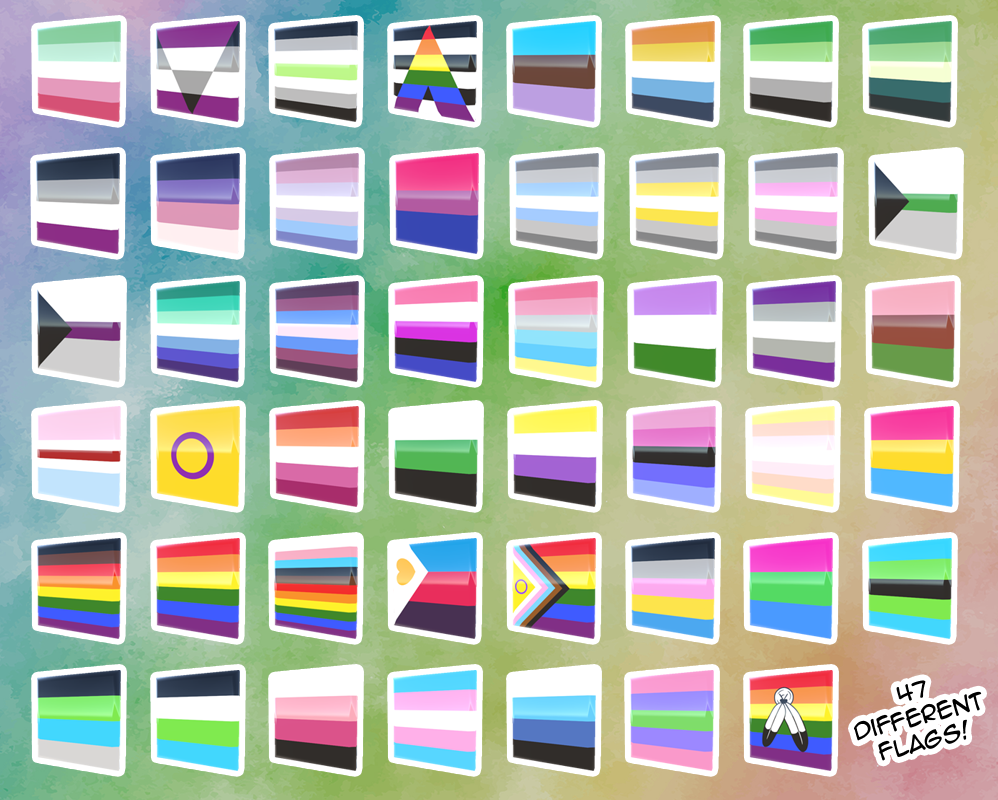 In alphabetical order: Abrosexual, Aegosexual, Agender, Ally, Androsexual, Aroace, Aromantic Spectrum, Aromantic, Asexual Spectrum, Asexual, Bigender, Bisexual, Demiboy, Demigender, Demigirl, Demiromantic, Demisexual, Gay Man, Genderfluid, Genderflux, Gender-nonconforming, Genderqueer, Gray Asexual, Hijra, Intersex, Lesbian, Neutrois, Nonbinary, Omnisexual, Pangender, Pansexual, Philedelphia Pride, Polyamory, Polygender, Polysexual, Pride, Progress Pride, Quoigender, Quoiromantic, Quoisexual, Transfem, Transgender, Transmasc, Trigender, and Two Spirit.