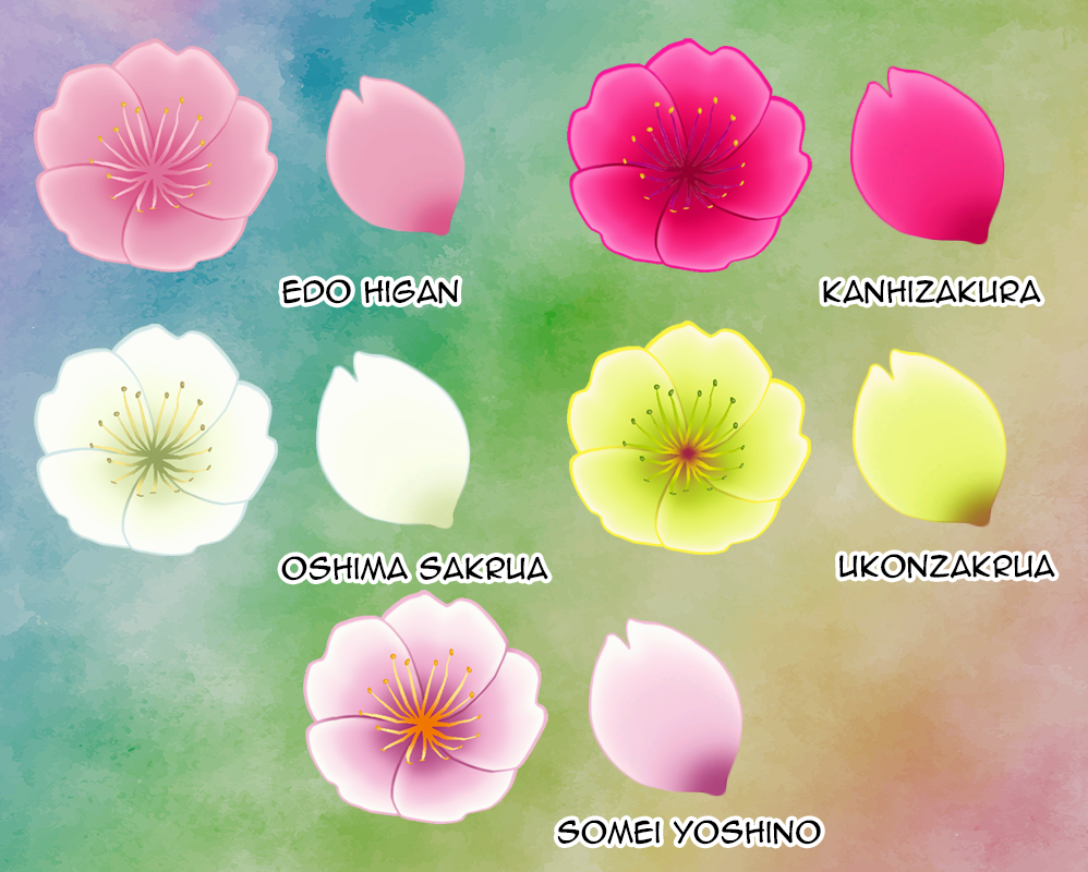 This is a set of 5 different leaves and petals based off of 5 different cherry tree types in Japan: Eido Higan, Kanhizakura, Oshima Sakura, Somei Yoshino, and Ukonzakura.