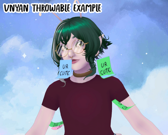 Note: Throwables are janky in VNyan - use at your own judgement! Please see the example for reference. Warudo seems to do a better job with guaranteeing throwables face outwards at readable angles. :)