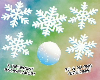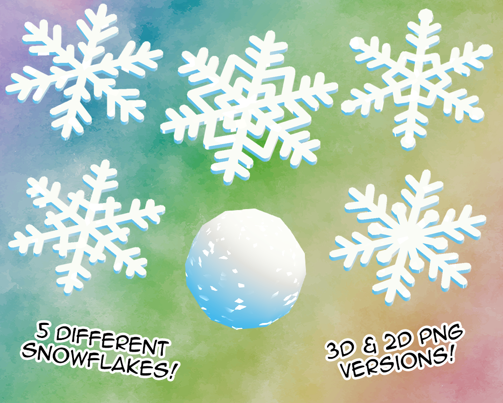 This is a set of 6 different snowflakes, both in 2D PNG and 3D, and one 3D snowball.